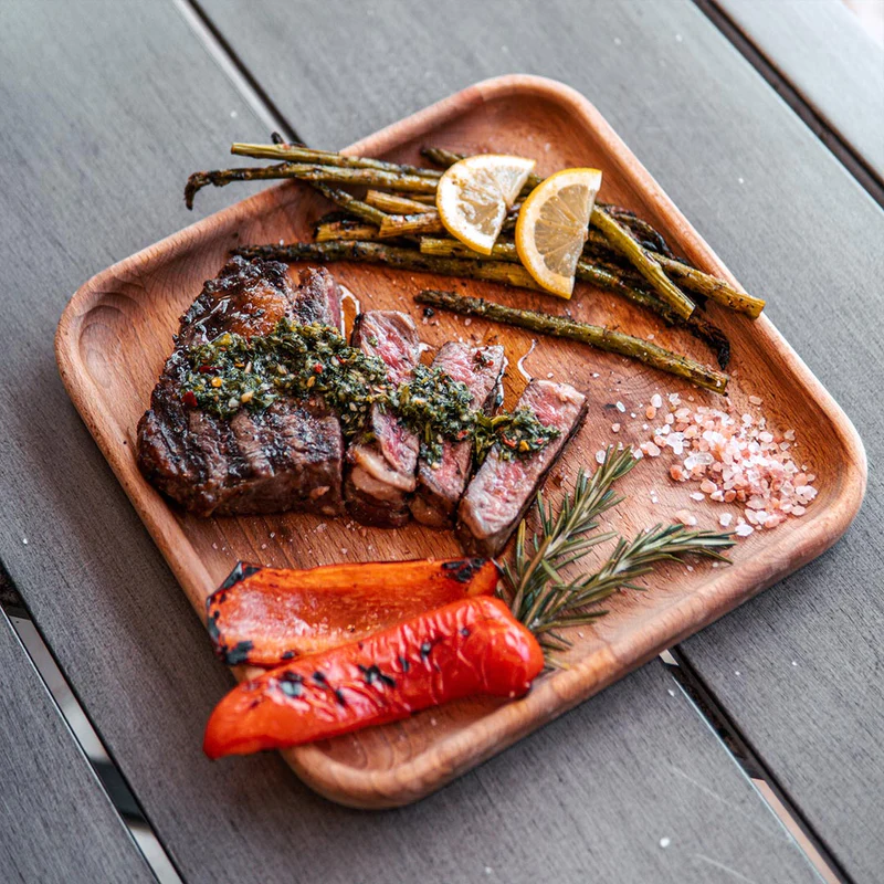 A beautiful plate with a fine beechwood finish that looks natural and can be used to serve various things, including but not limited to salads, vegetables, fruit, meat, cheese, steak, and snacks.